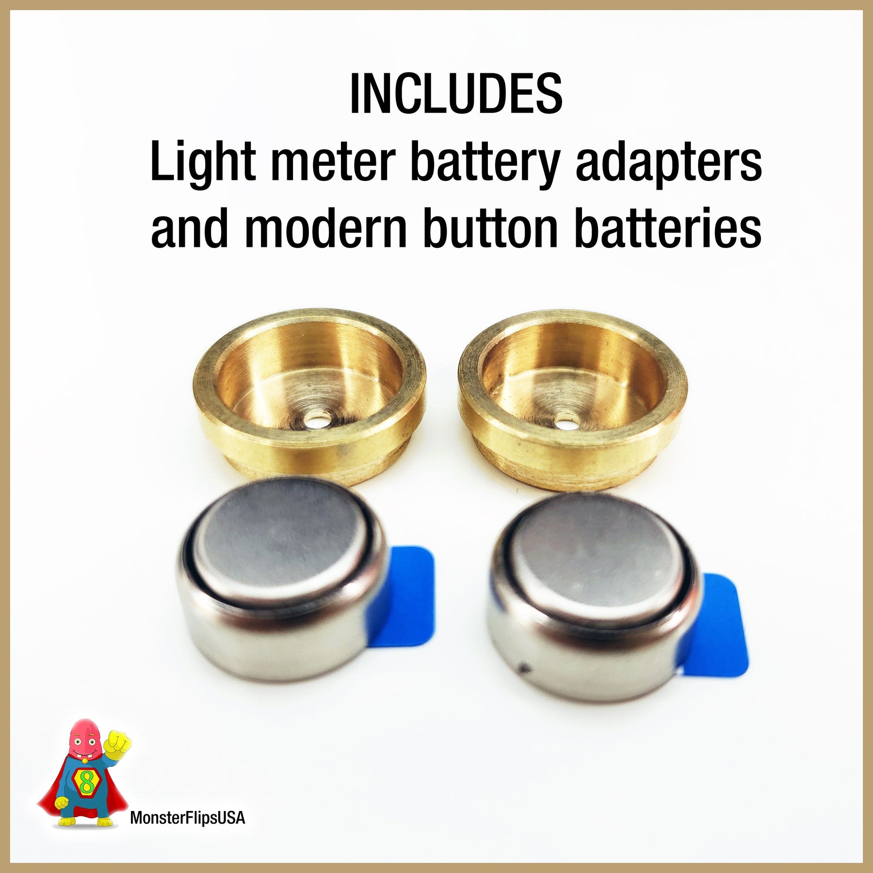 power source: 6 x AA batteries (not included) and 2 x button cells for light meter (included with adapters for modern batteries)
